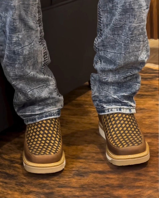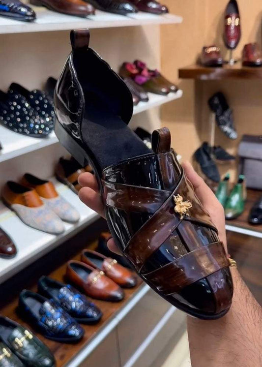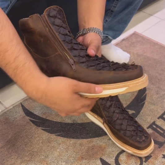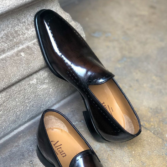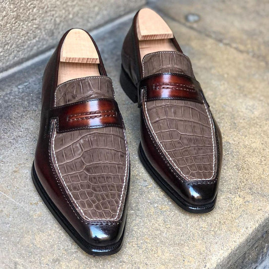 Bi-material Brown Alligator Nabuck Vamp and Mahoganny Patina on calf